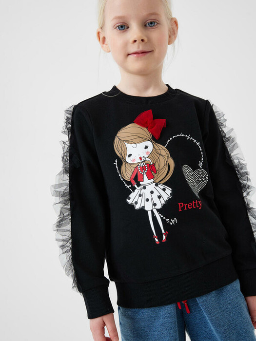 Детский свитшот оверсайз для девочки. Выполнен из хлопкового футера без начеса. На передней части — выразительный принт. Рукава декорированы оборками. Горловина, манжеты и низ изделия оформлены эластичными резинками.