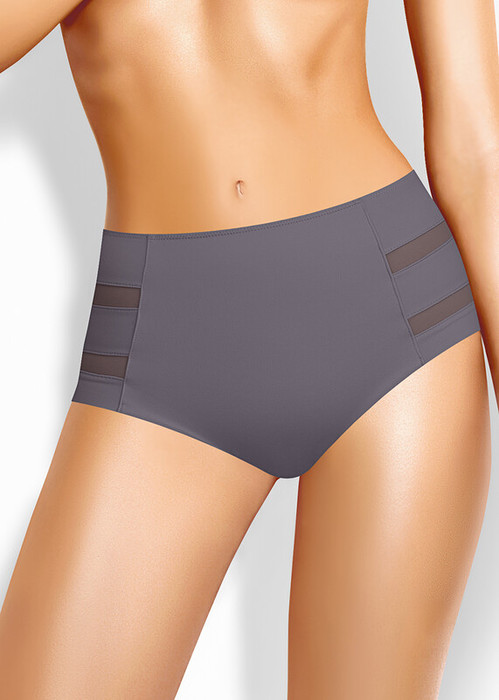Трусы слипы с завышенной посадкой, сзади и сбоку бесшовная гладкая обработка, спереди декоративные горизонтальные вставки из плотной сетки, перед дублирован сеткой, по талии обработка с зигзагом и узкой резинкой.