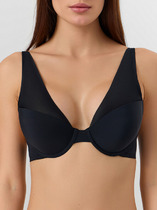 Бюстье женское с треугольными чашками из рибаны. Чашка с вытачкой, с чашками-вкладышами (FN-75.14) внутри, по переднему срезу обтачан подкладкой из кулирного полотна с эластичной тесьмой 6 мм внутри (жилка WT4-6, девсел 13460W). Бочки отрезные. Срез проймы и верхний срез стана обработан эластичной тесьмой 8 мм (жесткая б/зуба WTWE1-8, девсел 487W) в два приема.