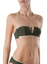 Бюстгальтер купальный бандо, со съемными бретелями. Лиф на подкладке, со съемными чашками-вкладышами (GNv-15m). Верхний и нижний срезы обработаны швом вподгибку с эластичной резиновой тесьмой внутри 10 мм. Съемные бретели из основного полотна с эл резиновой тесьмой 7 мм внутри, с регулировкой по длине. Регуляторы (2 шт) и застежки-крючки (4 шт) металлические с гальваническим покрытием. Бретели крепятся к бюстье черз петлю, заготовленную из парфюмерной ленты.