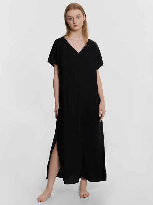 Платье прямого силуэта, длина макси. По переду и спинке средний шов. Горловина V-образной формы. Вырез горловины обработан в чистый край. Рукава цельнокроеные, обработаны в чистый край. По боковым швам разрезы. Низ платья обработан швом в подгибку.