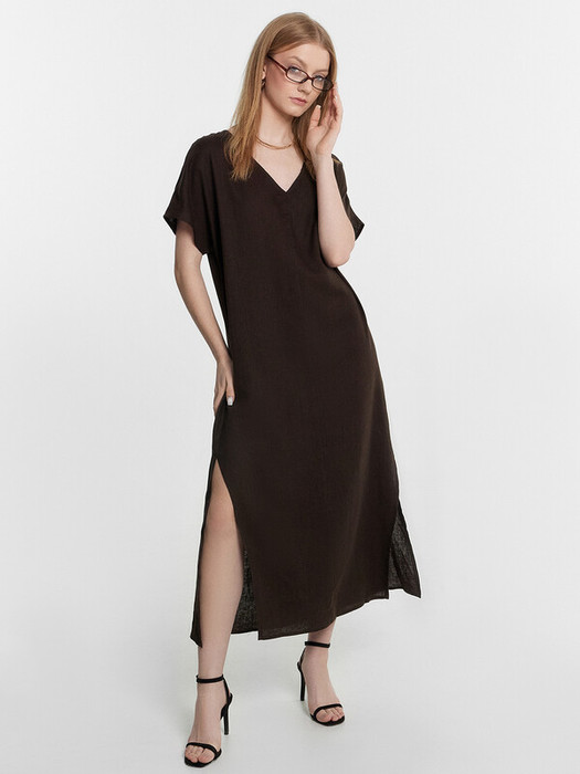 Платье прямого силуэта, длина макси. По переду и спинке средний шов. Горловина V-образной формы. Вырез горловины обработан в чистый край. Рукава цельнокроеные, обработаны в чистый край. По боковым швам разрезы. Низ платья обработан швом в подгибку.