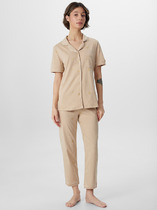 Женская пижама: рубашка прямого кроя на пуговицах с длинным рукавом и свободные брюки с поясом на резинке.