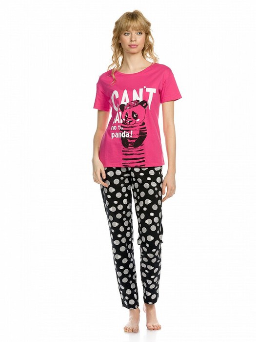 Комплект женский: футболка и брюки. Футболка прямого кроя среднего объема с втачным рукавом. Суперстойкий и эластичный принт. Перевод: "Не могу сказать нет панде". Брюки среднего объема на комфортной внутренней резинке.