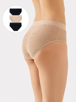 Женские трусы-шорты с низкой посадкой. Изготовлены по бесшовной технологии с минимум швов. Кромки по ноге и по талии подогнуты и приклеены, хлопковая приклеенная ластовица.  Нежное геометричное кружево по линии талии высотой 5 см – не передавливает тело и не натирает кожу.  Модель оценят те, кто ищет незаметное и невесомое белье на каждый день или особого случая.