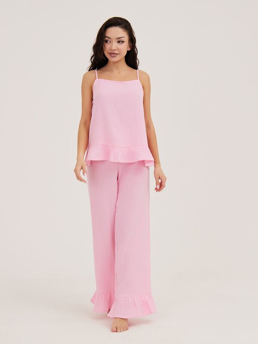 Пижама из жатого муслина (100% хлопок) нежно розового цвета выполнена из топа и брюк. Свободный топ на тонких регулируемых бретелях с воланом по низу изделия. Сободные брюки на резинке и воланами по низу брючин.