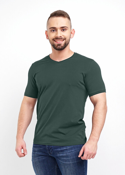 Базовая однотонная футболка стандартного объема с V вырезом горловины, втачным рукавом из хлопкового полотна с добавлением эластана. Является неотъемлемой частью мужского гардероба.