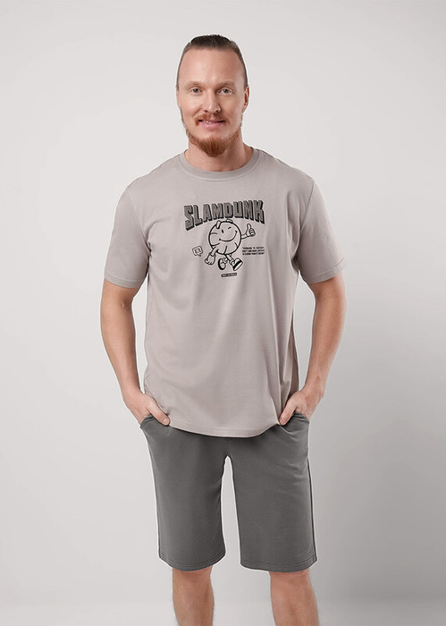 Комплект мужской для дома состоящий из футболки и шорт. Футболка из трикотажного полотна с круглым вырезом горловины, коротким рукавом и стильным принтом. Шорты из трикотажного полотна на эластичном поясе с функциональными карманами и шнуром.