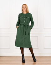 Бархатное платье простого покроя, расклешённое книзу с втачным рукавом длиной 3/4. По спинке застёжка на пуговицу.