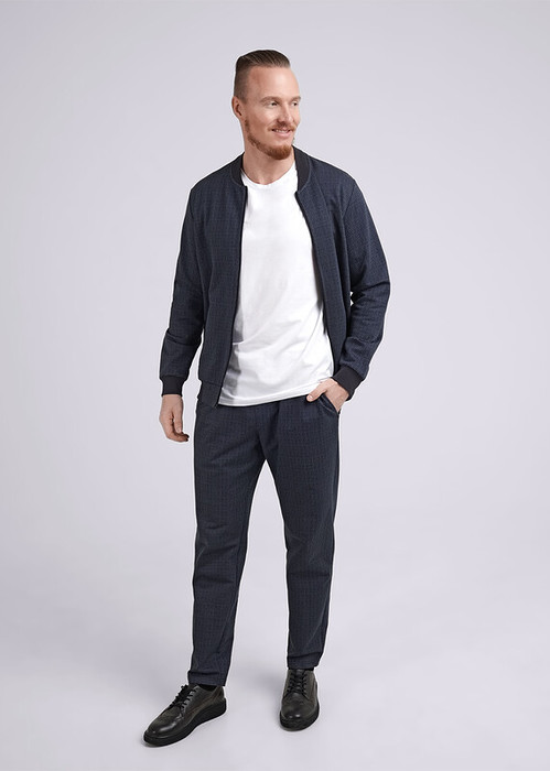 Мужской бомбер на молнии из трикотажного полотна с набивкой. Карманы добавляют удобства в носке, а плотный воротник и манжеты с поясом сохраняют тепло. Стильное решение для повседневного образа.