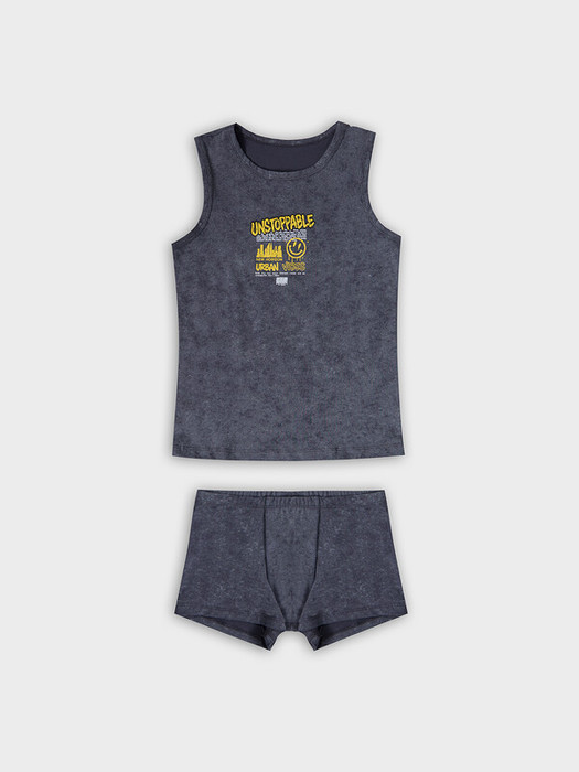 Майка полуприлегающего кроя с круглым вырезом не сковывает движений во время активных игр или отдыха. Трусы-боксеры без боковых швов с эластичной резинкой мягко сидят на талии, не оставляя следов. Забавная надпись и модный принт с летучими мышами делают комплект по-настоящему детским и современным. Практичный хлопок легко стирается и не теряет формы. Рекомендуем!