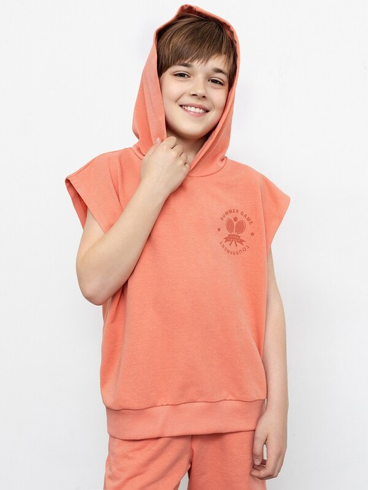 Стильная жилетка из легкого трикотажного футера. Силуэт модели свободный. Есть просторный уютный капюшон на подкладке. По нижнему краю проходит пояс из рибаны. Стильный жилет для вашего мальчика!