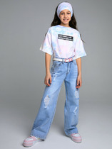Джинсы свободные для девочки подростка. Модель с высокой посадкой и широкими прямыми штанинами. Застежка — молния и болт. Пояс частично на резинке сзади и регулируется изнутри с помощью пуговиц. Модель выполнена из синего денима. Есть передние и задние карманы.
