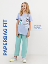 Широкие джинсы для девочки подростка. Застёжка на молнию и болт. В поясе предусмотрена внутренняя регулировка объёма с помощью резинки и пуговиц. Модель wide leg прямого кроя выполнены из варёного светло-синего денима. Спереди имеется принт из ярких белых и розовых капель, нанесённых на нижнюю часть штанин — спереди и сзади. Два передних и два задних кармана. В комплекте — съёмный яркий брелок на поясе.