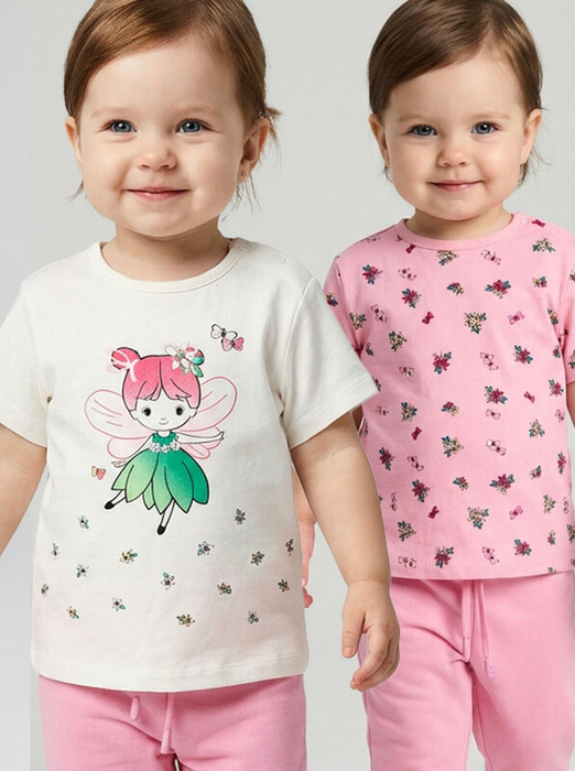 Набор детских футболок для девочки. Комплект из 2 футболок выполнен из хлопкового трикотажа джерси. Застежка на плече на кнопках для удобного переодевания. Нежные принты с цветами и феями.