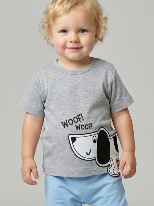 Детская футболка для мальчика. Модель прямого кроя, выполнена из мягкого хлопкового трикотажа интерлок. Спереди расположена аппликация с милой собачкой. Горловина круглая. На плече застежка на кнопки для удобного переодевания.
