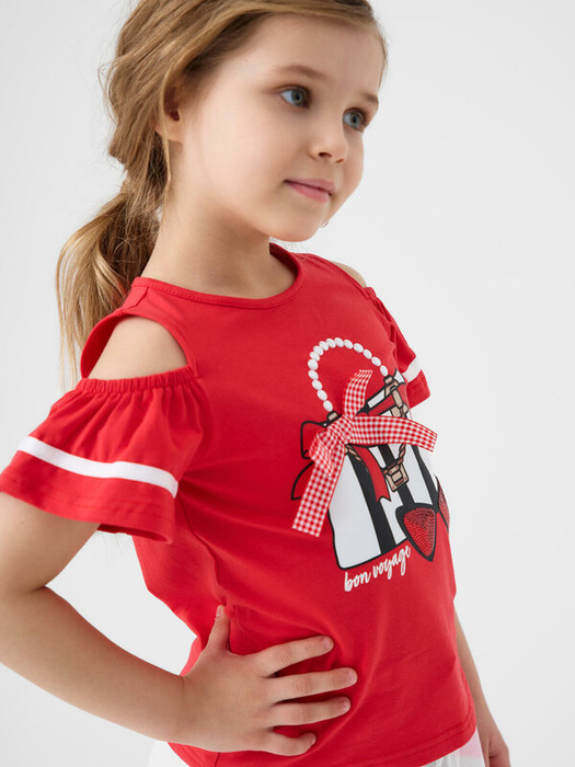 Детская футболка для девочки. Модель прямого кроя, выполнена из эластичного хлопкового трикотажа джерси. Спереди - яркий принт, паетки и декоративный бант. Горловина круглая. Вырезы на рукавах.