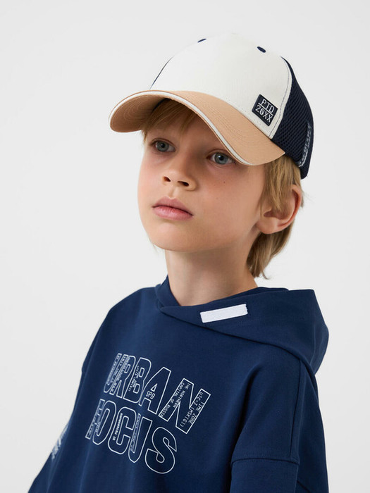 Бейсболка для мальчика подростка. Модель сочетает тканевый перед и дышащую сетку сзади. Спереди — небольшой принт, сбоку — ярлык. Козырек изогнутый. Застежка на кнопках сзади регулируется по объему. Есть вентиляционные отверстия.
