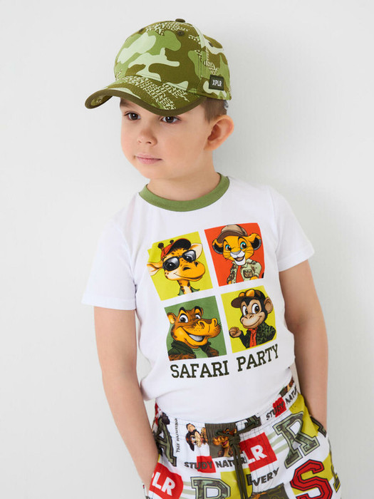 Детская бейсболка для мальчика. Модель выполнена в зелёной камуфляжной расцветке с текстовым принтом. Классическая форма с изогнутым козырьком, регулируемая застёжка на липучке сзади и декоративные элементы.