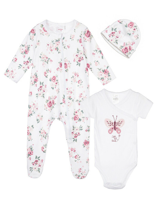 Комплект: боди, комбинезон, шапочка из 100% хлопка. Боди с запахом имеет 2 ряда кнопок, что позволяет ему расти вместе с малышом. Комбинезон с легкой фиксацией резинкой на пятке. Шапочка с завязками.