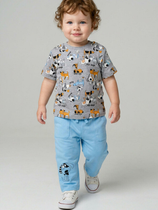 Детский костюм для мальчика. Состоит из футболки с коротким рукавом и брюк на резинке. Футболка прямого кроя с милыми принтами. Кнопки на плече для удобного переодевания. Брюки выполнены из хлопкового трикотажа, с комфортной посадкой, пояс на резинке дополнен шнурком. Удобные боковые карманы.
