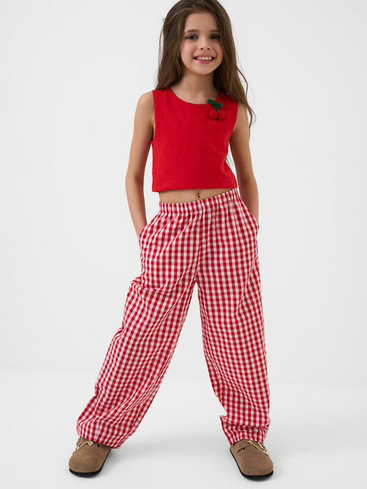 Комплект для девочки подростка. Базовый топ из хлопкового трикотажа в рубчик, декорирован объемными вишенками. Широкие брюки на резинке. Удобные боковые карманы.