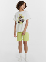 Детский костюм для девочки. Состоит из футболки с коротким рукавом и шорт. Выполнен из хлопкового трикотажа. Футболка прямого кроя, с рукавами-крылышками и красочным принтом. Шорты свободные, хорошо сидят на талии благодаря эластичному поясу и регулирующему шнурку.