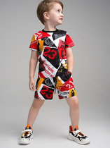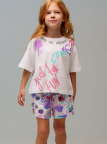 Легкий детский комплект для девочки. Выполнен из мягкого хлопкового трикотажа джерси, состоящий из укороченной футболки и юбки-шорт. Футболка свободного кроя с ярким принтом. Пышная юбка на резинке с воланами, внутри имеет удобные шорты, что делает модель практичной для активного отдыха.