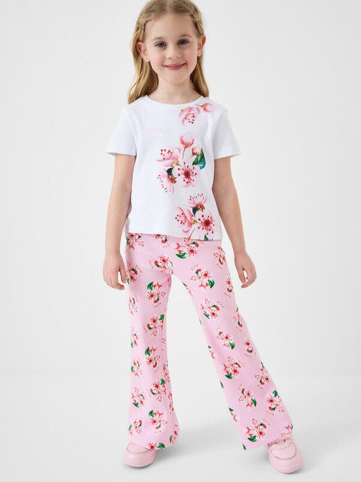 Детский комплект для девочки. Состоит из футболки и брюк клеш на резинке. Выполнен из хлопкового трикотажа. Футболка прямого силуэта, с короткими рукавами. Украшена нежным цветочным принтом. Брюки — расклешенные с эластичным поясом.