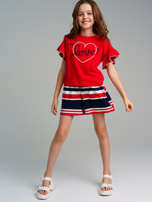 Комплект: футболка, шорты из качественного и приятного на ощупь трикотажа джерси. Высокое содержание хлопка 95%. Благодаря наличию эластана в составе ткани изделие проще в уходе и держит форму. Укороченная футболка oversize. Шорты comfort fit. Эластичный пояс со шнурком. Карманы в боковых швах.