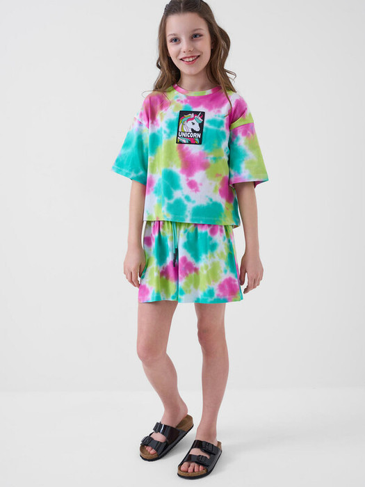 Стильный костюм для девочки подростка. Состоит из футболки с коротким рукавом и шорт. Укороченная футболка оверсайз с принтом. Шорты свободные, короткие, хорошо сидят на талии благодаря эластичному поясу и регулирующему шнурку. Удобные боковые карманы.