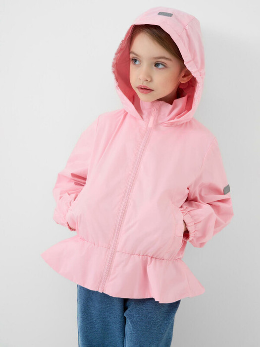 Ветровка детская для девочки. Температурный режим от +20С до +10С. Ткань с ветрозащитным и водоотталкивающим покрытием. Внутри трикотажная подкладка. Капюшон несъёмный, хорошо прилегает за счёт резинки. Боковые карманы на магнитных кнопках. Внутренний карман на липучке. Манжеты на резинке. Изделие украшено оборкой по низу и декоративными бантами на карманах. Отличный выбор на весну и осень.