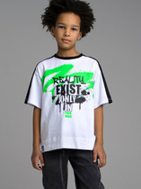 Майка для мальчика подростка. Модель прямого силуэта, без рукавов, с круглой горловиной. Выполнена из сетки. Спереди — крупный принт. Внизу  — маленькая нашивка.