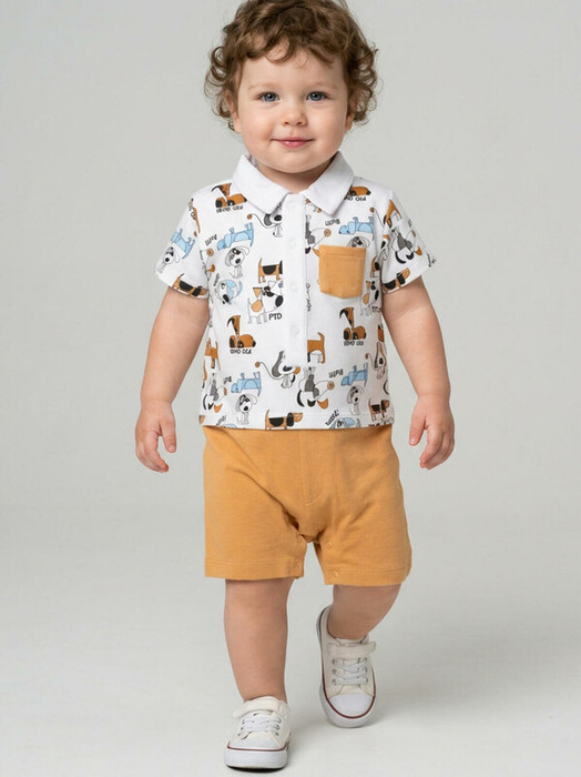 Детский песочник для малыша. Верх оформлен как рубашка с отложным воротником и короткими рукавами, а низ — как однотонные шорты. Спереди есть накладной кармашек и планка на кнопках для удобства переодевания. В нижней части предусмотрены кнопки для быстрого переодевания. Материал — мягкий, хлопковый трикотаж интерлок. Верх украшен ярким принтом с собаками и надписями.