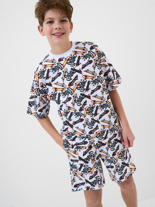 Пижама для мальчика подростка. Комплект, состоящий из футболки оверсайз с коротким рукавом и шорт. Изделие выполнено из мягкого хлопкового трикотажа. Главная особенность — яркий и стильный принт по всей поверхности с изображениями скейтбордов. Футболка с круглым воротом, шорты на резинке с регулирующим шнурком. Есть боковые карманы.