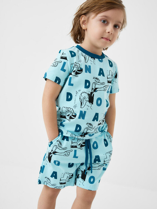 Детская пижама для мальчика. Комплект состоит из футболки, прямого кроя с короткими рукавами и шортов. Материал — мягкий хлопковый трикотаж с ярким принтом. Футболка с круглым вырезом и удобной горловиной из риба. Шорты на мягкой резинке и со шнурком для регулировки. Боковые карманы.