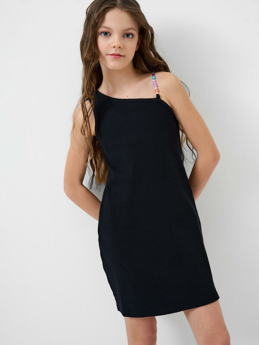Платье для девочки подростка. Выполнено из мягкого хлопкового трикотажа в рубчик. Платье прямого силуэта, длиной до колена. Модель асимметричная: с одной стороны открытое плечо, с другой — тонкая декоративная лямка, украшенная яркими бусинами.