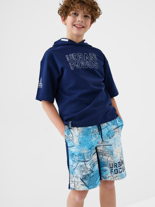 Шорты для мальчика подростка. Модель свободного кроя из мягкого, хлопкового трикотажа футер. Удобная посадка обеспечивается эластичным поясом со шнуром. Спереди — боковые карманы. Шорты украшены принтом с картой Санкт-Петербурга.