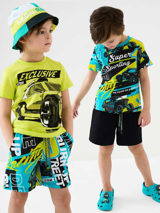 Набор детских шорт для мальчика. В комплект входят две пары шорт свободного кроя, длиной выше колена. Модели из мягкого, хлопкового трикотажа джерси. Удобная посадка обеспечивается эластичным поясом со шнуром. По бокам расположены два кармана.