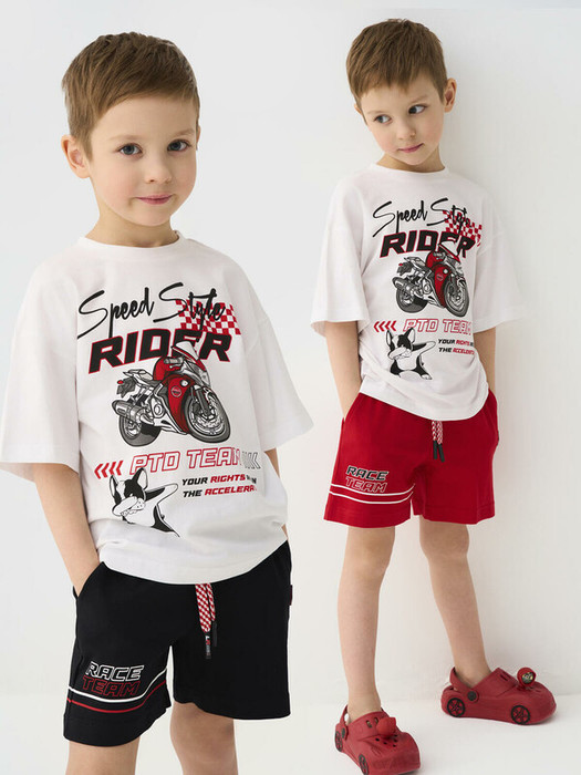 Набор детских шорт для мальчика. В комплект входят две пары шорт свободного кроя, длиной выше колена. Принты в гоночной тематике. Модели из мягкого, хлопкового трикотажа джерси. Удобная посадка обеспечивается эластичным поясом со шнуром. По бокам расположены два кармана.
