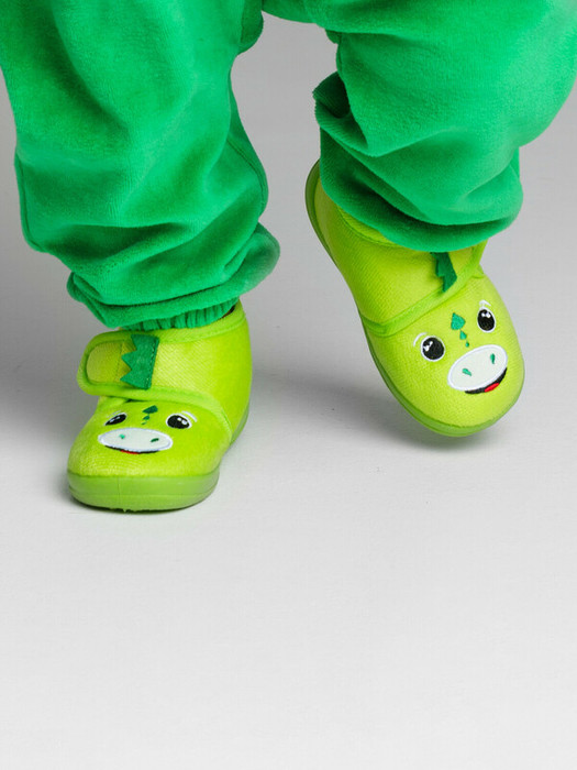 Верх тапочек выполнен из изностойкого текстиля с мягкой, приятной на ощупь поверхностью. Подкладка и стелька из трикотажа с высоким содержанием хлопка 95%.Противоскользящая подошва с защитой задней части. Конструкция с широкой липучкой позволяет легко обувать тапочки на малышей.
