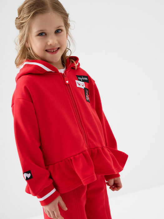 Детская толстовка на молнии для девочки. Выполнена из хлопкового футера без начеса. Прямой крой. На груди — выразительный принт. На рукаве - нашивка. Манжеты оформлены эластичными резинками. Низ изделия с декоративными рюшами.