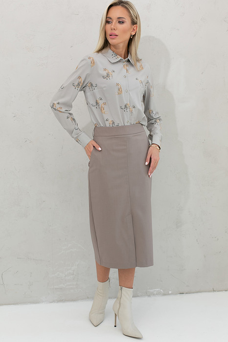 Юбка прилегающего силуэта из костюмной ткани. По центру передней части изделия выполнен шов, снизу шлица. Сзади по среднему шву застёжка-молния. Пояс притачной со шлёвками. Карманы с подкройным бочком.