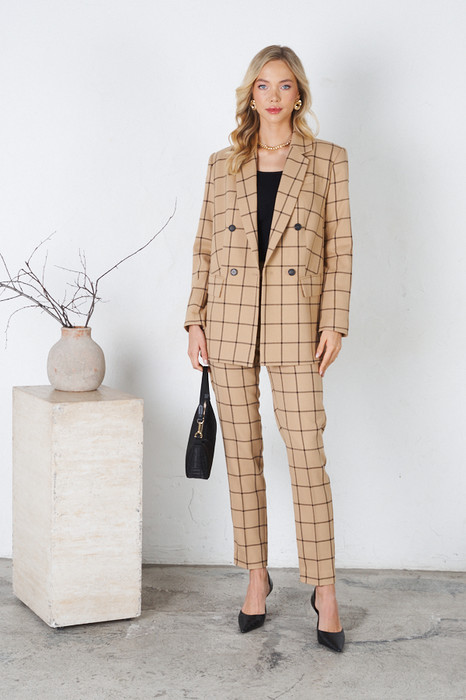 Брюки прямого силуэта, чуть зауженные книзу из костюмной ткани. Пояс притачной с эластичной резиной.