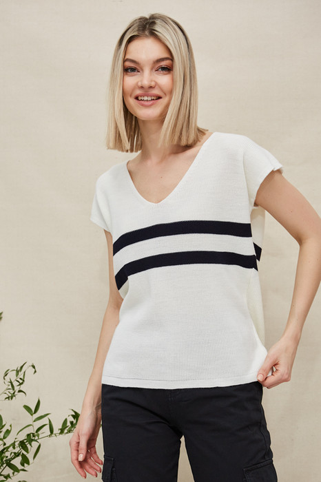 Джемпер свободного силуэта с фактурой «жемчужный узор». Спущенная линия плеча. Низ изделия, линия проймы и V-образный вырез горловины оформлены двойной нитью для усиления, что препятствует деформации в процессе носки. Изделие выполнено из мягкой структуриванной пряжи.