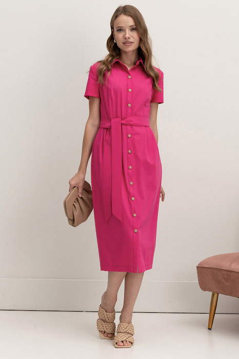 Платье приталенного силуэта из вискозной плательной ткани. Изделие отрезное по линии талии с защипами. В боковых швах карманы. Втачной короткий рукав. Притачная планка с застёжкой на пуговицы. Вырез горловины обработан отложным воротником на стойке. В комплекте пояс из основной ткани.