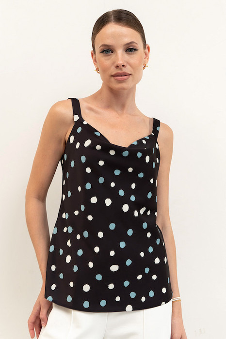 Топ с «качелями» в зоне декольте смотрится очень женственно. Изделие на бретелях полуприлегающего силуэта из атласной блузочной ткани.