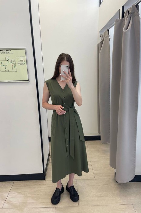 Платье из вискозной ткани полуприлегающее в области груди и свободное в области бедер. Изделие отрезное по линии талии с застёжкой на пуговицы и накладными карманами. На задней части платья выполнена кокетка. V-образный вырез горловины, визуально делает фигуру стройнее. В комплекте пояс из основной ткани.