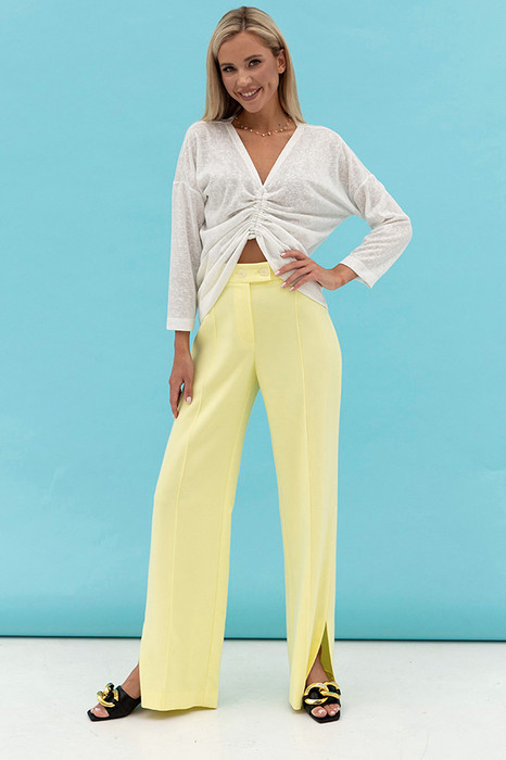 Брюки прямого силуэта, с разрезами в боковых швах из костюмной ткани. На передней части брюк застрочены стрелки. Притачной пояс со шлёвками. Застёжка на молнию-гульфик и пуговицу. Секрет такой модели кроется в безупречно точной посадке по талии и бедрам – ничего лишнего, только конструктивные детали, которые придают четкость линиям силуэта.