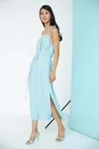 Платье приталенного силуэта из вискозной плательной ткани. Изделие отрезное по линии талии с защипами. В боковых швах карманы. Втачной короткий рукав. Притачная планка с застёжкой на пуговицы. Вырез горловины обработан отложным воротником на стойке. В комплекте пояс из основной ткани.